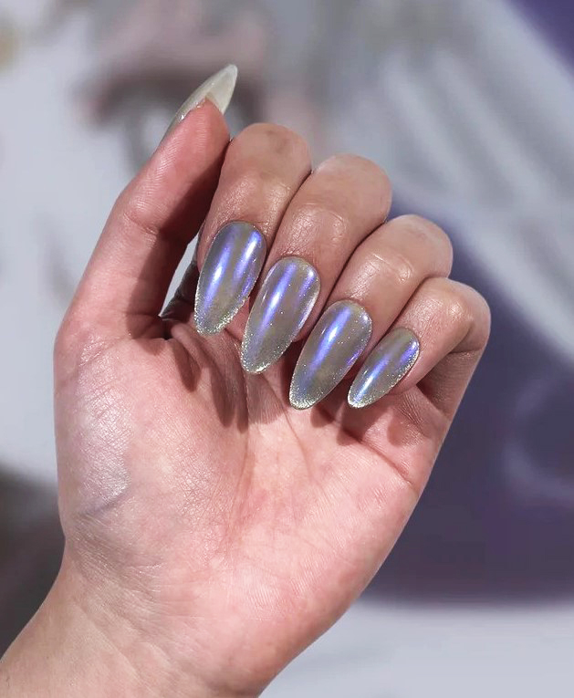 With their hypnotic, shifting shimmer that looks like a feline’s eye catching the light, these nails offer a perfect blend of elegance and edge.